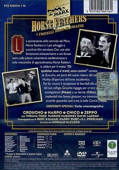 I fratelli Marx al college (Horse Feathers), conosciuto anche come Piume di cavallo, è una commedia statunitense del 1932 diretta da Norman Z. McLeod con i fratelli Marx. Nel 2000 l'AFI lo ha inserito al sessantacinquesimo posto nella classifica delle migliori cento commedie americane di tutti i tempi. Il film è una satira sul mondo accademico, e Groucho interpreta il ruolo del professor Quincy Adams Wagstaff, preside dello sfortunato Huxley College, l'unica università la cui squadra non ha mai vinto un campionato di football dal 1888. Nella prima scena, abbigliato con toga e tocco, si rivolge al corpo insegnanti, dimostrando totale disprezzo per le regole della vita accademica: « Basta dare un'occhiata ai vostri avidi volti, per capire facilmente perché la nostra università è nelle condizioni attuali » (dai dialoghi del film) Grazie a I fratelli Marx al college, il 13 agosto 1932 i fratelli Marx conquistarono la copertina di Time, un evento che segnava la misura del loro successo nazionale.