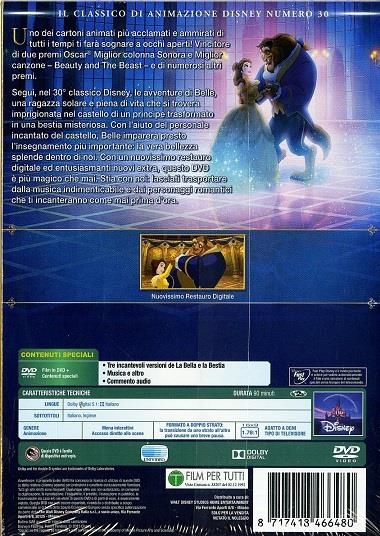 Uno dei cartoni animati più acclamati e ammirati di tutti i tempi ti farà sognare a occhi aperti! Segui le avventure di Belle, una ragazza solare e piena di vita che si troverà imprigionata nel castello di un principe trasformato in una bestia misteriosa. Con l'aiuto del personale incantato del castello, Belle imparerà presto l'insegnamento più importante: la vera bellezza splende dentro di noi. Con un nuovissimo restauro digitale ed entusiasmanti nuovi extra, questo DVD in edizione speciale a 2 dischi è più magico che mai. Stai con noi: lasciati trasportare dalla musica indimenticabile e dai personaggi romantici che ti incanteranno come mai prima d'ora!