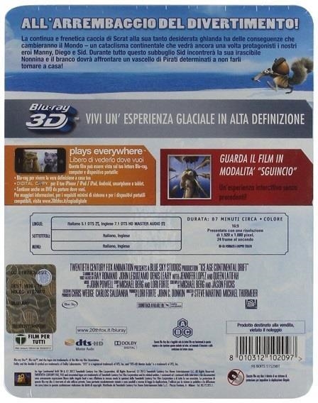 La continua e frenetica caccia di Scrat alla sua tanto desiderata ghianda ha delle conseguenze che cambieranno il mondo - un cataclisma continentale che vedrà ancora una volta protagonisti i nostri eroi Manny, Diego e Sid. Durante tutto questo subbuglio Sid incontrerà la sua irascibile Nonnina e il branco dovrà affrontare un vascello di pirati determinati a non farli tornare a casa!... Per la visione in 3D è necessario disporre di TV 3D Full HD, occhiali 3D compatibili (non inclusi), lettore Blu-ray Disc 3D o PS3 e cavo HDMI ad alta velocità