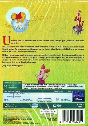 Un tenero orso, con moltissimi amici in tutto il mondo: arriva l'eroe più goloso, simpatico e pasticcione che ci sia. Nel 22° Classico di Walt Disney prende vita il mondo incantato di Winnie the Pooh e dei suoi piccoli amici: il timido Pimpi, il grintoso Tigro, sempre pieno di ingegnose trovate, il saggio Uffa e Christopher Robin, il fortunato bambino che vive con loro le avventure più straordinarie. Nel loro magico mondo scoprirete un posto molto speciale che si chiama Bosco dei cento Acri, una radura sospesa tra fantasia e realtà in cui inventare tanti giochi e fare ogni giorno mille scoperte. Una dolcissima storia piena di amicizia e di miele, con un'animazione da Oscar e una splendida colonna sonora, che regalerà a grandi e piccini la tenerezza di un nuovo simpatico amico.