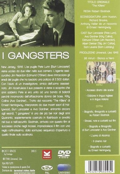 Tratto dal racconto "The Killers" di Ernest Hemingway, interpretato da due mostri sacri di Hollywood, Burt Lancaster e Ava Gardner, entrambi ancora agli esordi, "I gangsters" è uno dei più bei noir degli anni Quaranta, sapientemente costruito in flashback e avvolto nel buo e nell'oscurità. Siodmak, arrivato con questo film al successo anche negli incassi, impreziosisce il film con una regia raffinatissima, dalla sontuosa sequenza d'apertura a quella finale sulla scalinata.