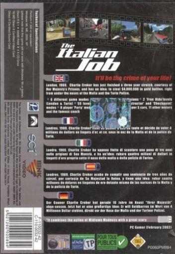 IL gioco per Playstation, campione d'incassi in inghilterra, arriva sul mercato PC con una nuova e spettacolare grafica. Il gioco tratto da uno dei più bei Kult Movie degli anni 60 è tornato! Charlie Croker (nel film Michael Kane)appena uscito di prigione deve organizzare un colpo da 4.000.000 di dollari a Torino aiutato dalla sua gang (tra cui Benny Hill)inizia la parte più spettacolare del film un epico inseguimento per la città di torino a base di Mini Cooper, Mafia e Polizia. il gioco riproduce fedelmente queste scene dando vita ad un action game d'inseguimento che passera da Londra, le Alpi e Torino...tutto ovviamente musicato e amibientato in pieni anni 60! Caratteristiche: 5 modalità di gioco differenti; 16 livelli nella modalità "The Italian Job"; 2 Livelli Free Ride (Londra & Torino); 10 Livelli Gara; 20 Livelli Distruzione; 20 Livelli Checkpoint; 'Party Play' fino a 8 giocatori; 14 veicoli differenti da guidare presi direttamente dal film,tra cui: Austin Mini Cooper S, Aston Martin DB4, E-Type Jaguar ed il bus a 2 piani. Città di Londra e Torino fedelmente riprodotte. Totale libertà di movimento all'interno dello scenario.