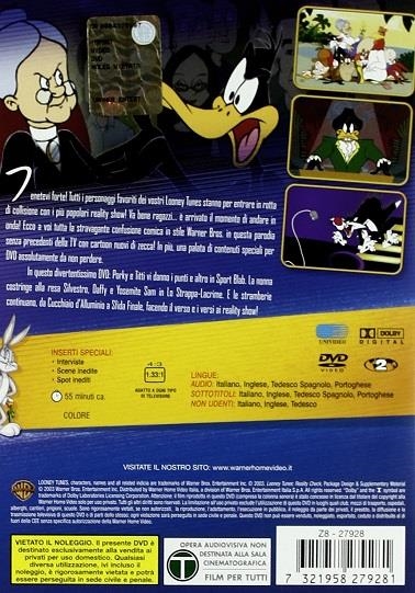Tenetevi forte! Tutti i personaggi favoriti dei vostri Looney Tunes stanno per entrare in rotta di collisione con i più popolari reality show! Va bene ragazzi… è arrivato il momento di andare in onda! Ecco a voi tutta la stravagante confusione comica in stile Warner Bros. in questa parodia senza precedenti della TV con cartoon nuovi di zecca! In più, una palata di contenuti speciali per DVD assolutamente da non perdere.In questo divertentissimo DVD: Porky e Titti vi danno i punti e altro in Sport Blab. La nonna costringe alla resa Silvestro, Daffy e Yosemite Sam in Lo Strappa-Lacrime. E le stramberie continuano, da Cucchiaio d'Alluminio a Sfida Finale, facendo il verso e i versi ai reality show!