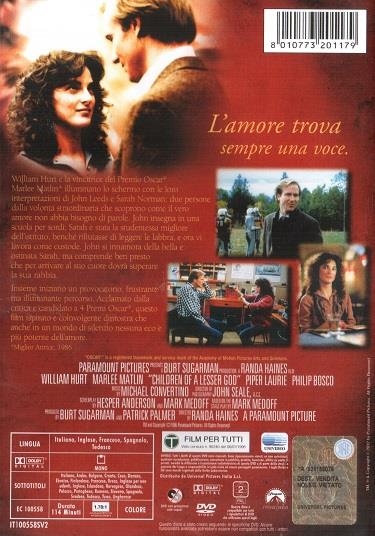 Uno dei film degli anni ottanta più amati dalla critica. Children of a Lesser God ha ricevuto quattro candidature all'Oscar® e Marlee Matlin si è guadagnata l'Oscar® come migliore attrice. Basato sulla famosa commedia di Brodway, è l'esilarante storia d'amore di John Leeds (William Hurt), un insegnante idealista di bambini con handicap, e Sarah (Marlee Matlin), una ragazza sorda testarda e determinata. All'inizio, Leeds vede Sarah come una sfida accademica, ma presto il loro rapporto insegnante-alunna sboccia in un amore così passionale da distruggere la barriera di silenzio che li separa.