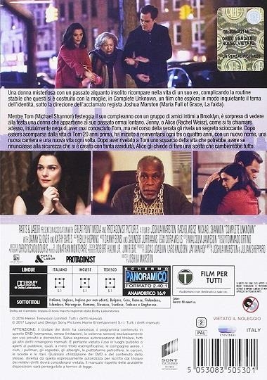 Una donna misteriosa con un passato alquanto insolito ricompare nella vita di un suo ex, complicando la routine stabile che questi si è costruito con la moglie, in Complete Unknown, un film che esplora in modo inquietante il tema dell'identità, sotto la direzione dell'acclamato regista Joshua Marston (Maria Full of Grace, La faida). Mentre Tom (Michael Shannon) festeggia il suo compleanno con un gruppo di amici intimi a Brooklyn, è sorpreso di vedere alla festa una donna che appartiene al suo passato ormai lontano. Jenny, o Alice (Rachel Weisz), come si fa chiamare adesso, inizialmente nega di aver mai conosciuto Tom, ma nel corso della serata gli rivela un segreto scioccante. Dopo essere scomparsa dalla vita di Tom 20 anni prima, ha iniziato a reinventarsi ogni tre o quattro anni, con un nuovo nome, una nuova carriera e una nuova vita ogni volta. Dopo aver rivelato a Tom uno squarcio della vita che potrebbe avere se rinunciasse alla sicurezza che si è creato con tanta assiduità, Alice gli chiede di fare una scelta che cambierebbe tutto...