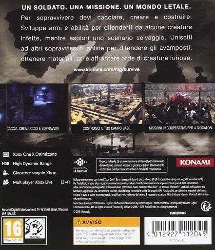 Torna la saga di Metal Gear con METAL GEAR SURVIVE un gioco co-op ambientato dopo gli eventi di METAL GEAR SOLID V: GROUND ZEROES. I giocatori, dopo aver attraversato una sorta di buco spazio temporale, si ritroveranno in un terrificante universo alternativo, caratterizzato dalla presenza di creature e ambienti ostili e dovranno cercare di sopravvivere e di trovare il modo per tornare nel loro mondo. I protagonisti di METAL GEAR SURVIVE non si limiteranno a dover combattere orde di creature mortali ma dovranno anche esplorare il territorio alla ricerca di acqua e di cibo per sopravvivere. I materiali raccolti nel corso della campagna potranno essere utilizzati per costruire armi, barricate, campi base - dove poter anche coltivare la terra e allevare il bestiame - e tanti altri oggetti utili. Oltre ai celebri Walker Gear e Sistemi di Recupero Fulton, questo nuovo episodio vedrà la presenza di una nuova varietà di armi e di equipaggiamenti. Caratteristiche: Stile di gameplay rinnovato, simile a quello del pluri-premiato METAL GEAR SOLID V ma arricchito anche da nuove meccaniche stealth e survival. Modalità single player e co-op a 4 giocatori. In single player ci si focalizzerà sulla gestione risorse, la progressione del personaggio, lo sviluppo del campo base e il crafting di armi e oggetti utilizzabili anche nella modalità co-op. Nella modalità multiplayer i giocatori combatteranno in squadra insieme ai loro compagni e collezioneranno oggetti utilizzabili anche nella compagna single player.