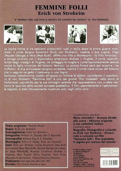 Sontuoso melodramma costato all'apoca un milione di dollari, considerato il capolavoro di von Stroheim, “Femmine folli” è uno dei grandi ‘film maledetti' nella storia di Hollywood, soprattutto per le sue immagini spietate che rappresentano con crudele realismo le ipocrisie della società europea postbellica. Il film, pesantemente e ripetutamente tagliato, è stato faticosamente ricostruito solo negli ultimi anni.