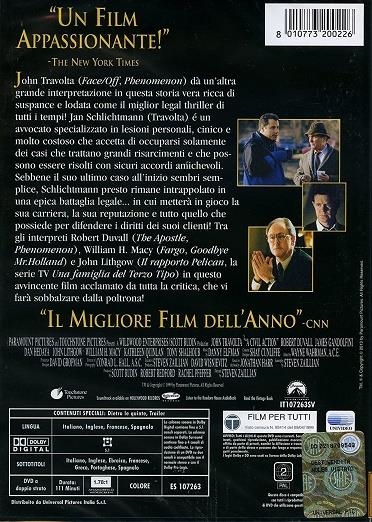 John Travolta (Face/Off, Phenomenon) dà un'altra grande interpretazione in questa storia vera ricca di suspance e lodata come il miglior legal thriller di tutti i tempi! Jan Schlichtmann (Travolta) è un avvocato specializzato in lesioni personali, cinico e molto costoso che accetta di occuparsi solamente dei casi che trattano grandi risarcimenti e che possono essere risolti con sicuri accordi amichevoli. Sebbene il suo ultimo caso all'inizio sembri semplice, Schlichtmann presto rimane intrappolato in una epica battaglia legale... in cui metterà in gioco la sua carriera, la sua reputazione eutto quello che possiede per difendere i diritti dei suoi clienti! Tra gli interpreti Robert Duvall (The Apostle, Phenomenon), William H. Macy (Fargo, Goodbye Mr.Holland= e John Lithgow (Il rapporto Pelican, la serie TV Una famiglia del Terzo Tipo) in questo avvincente film acclamato da tutta la critica, che vi farà sobbalzare dalla poltrona!